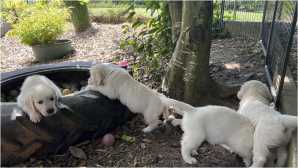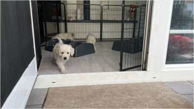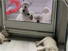 Es ist nichts mehr sicher: Egal ob drinnen oder draußen, ob schönes Wetter oder Regen, interessant ist ALLES, egal, ob es drinnen der Saugroboter ist, der rumfährt oder draußen der Rasenmäher. Welpenzimmer putzen ist so gut wie gar nicht möglich, wenn die kleine Bande dabei ist - da hat man keine Chance, den Wischer zu bewegen, weil sie ringsum versammelt sind und zum Teil natürlich auch draufsitzen ;-) Draußen ist es der Gummischieber, mit dem wir das Wasser von der Terrasse wegwischen wollen.