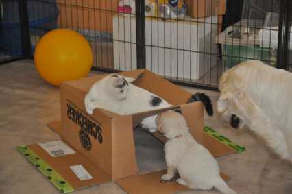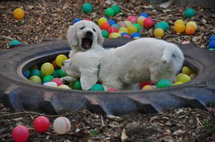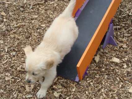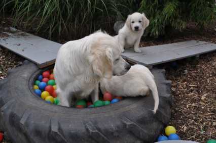 Wenn das Wetter es zulässt, dürfen sie ab ca. 4 Wochen stundenweise in unseren Welpenspielgarten mit Bällebad, Tunnel, Wippe, Schaukel, Wasserbecken und verschiedenen Untergründen wie Steine, Kies, Holz, Rasen, Erde usw. - auch die üblichen Umweltgeräusche bekommen sie so automatisch mit. Sie haben hier ca. 400 qm zum Entdecken und Spielen zur Verfügung, können viele Eindrücke sammeln und werden gut auf ein zukünftiges Leben ohne Angst und Scheu geprägt.