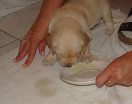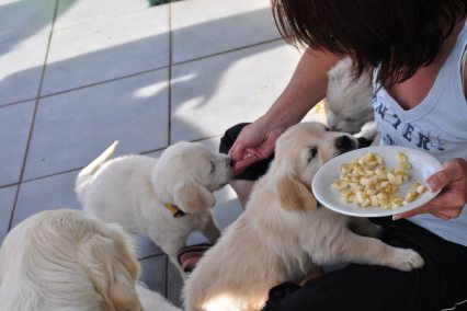 Rinderhack, Welpenmilch und Welpenfutter - mit 5 Wochen bekommen sie außerdem zum Welpenfutter Haferflocken, Körnerkäse,