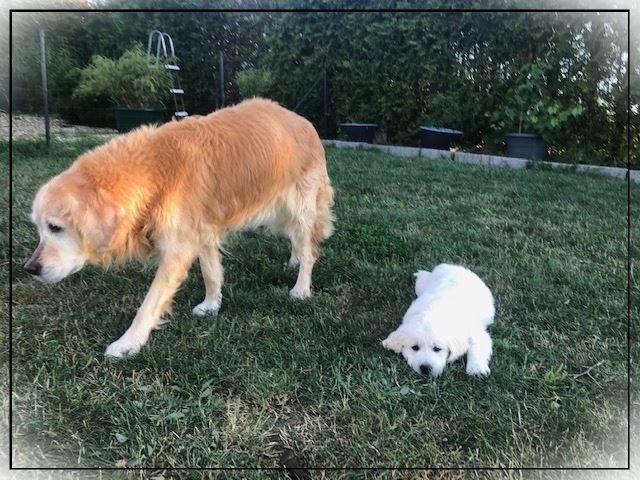 Mit anderen Tieren versteht sie sich ausnahmslos sehr gut, was vielleicht auch daraufhin zurückzuführen ist, dass sie bei uns mit Katze, Hamster und Zwergkaninchen aufgewachsen ist und auch in der Welpenschule mit anderen Hunden zusammen war.
